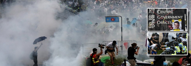 Κλιμακώνονται τα έντονα επεισόδια στο Χονγκ Κονγκ, με την αστυνομία να χρησιμοποιεί τεράστιες ποσότητες δακρυγόνων και χημικών για να απομακρύνει δεκάδες χιλιάδες διαδηλωτές που περικύκλωσαν το κτίριο της τοπικής κυβέρνησης προκειμένου να διαμαρτυρηθούν για την πρόθεση της Κίνας –που ανέκτησε το Χονγκ Κονγκ το 1997– ο μελλοντικός επικεφαλής της τοπικής κυβέρνησης να εκλέγεται από το 2017 με καθολική ψήφο, αλλά μόνο μεταξύ δύο ή τριών υποψηφίων, επιλεγμένων από μια επιτροπή υπό τον έλεγχό της.