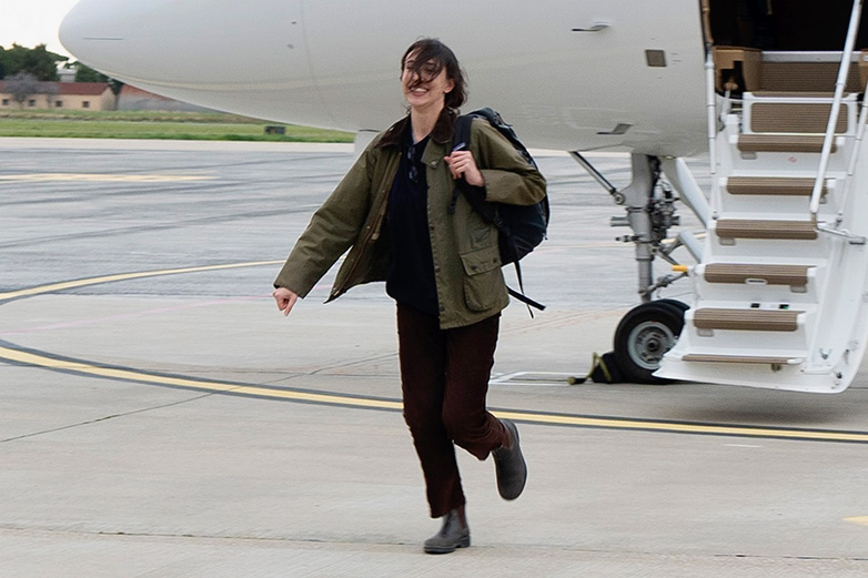Σε βίντεο και φωτογραφίες που δημοσίευσε ο ιταλικός Τύπος, η Σεσίλια Σάλα φαίνεται να βγαίνει τρέχοντας από το αεροσκάφος και να αγκαλιάζει τον σύντροφό της, Daniele Raineri. Στο αεροδρόμιο την υποδέχτηκαν επίσης οι γονείς της, αλλά και η πρωθυπουργός της χώρας, Τζόρτζια Μελόνι.