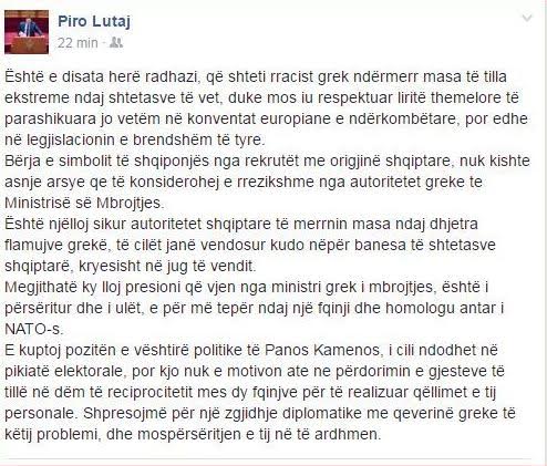 Ο Πύρο Λουτάι χαρακτηρίζει την Ελλάδα «ρατσιστικό» κράτος και κάνει λόγο για «ακραία μέτρα εναντίον των πολιτών του χωρίς να σέβεται τις ελευθερίες τους. Μάλιστα, στην προκλητική ανάρτησή του στο fecebook ο Αλβανός βουλευτής παραλληλίζει το σήμα του αετού που έκαναν οι νεοσύλλεκτοι αλβανικής καταγωγής με τις ελληνικές σημαίες που υψώνουν στην Αλβανία ομογενείς.