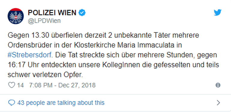 Σύμφωνα με την εφημερίδα Kronen Zeitung δύο ένοπλοι επιτέθηκαν το μεσημέρι της Πέμπτης σε μια καθολική εκκλησία.