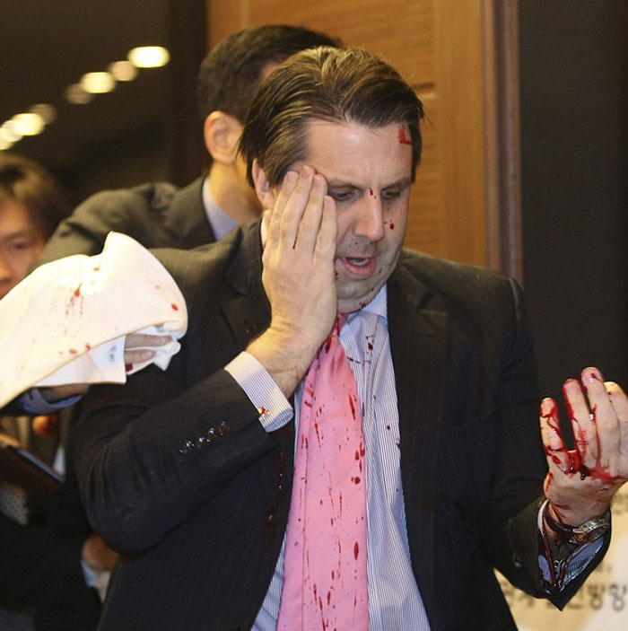 Όπως μετέδωσε το ιαπωνικό ειδησεογραφικό πρακτορείο Kyodo News, δεν είναι η πρώτη φορά που ο 55χρονος άνδρας επιτίθεται σε ξένο διπλωμάτη. Το 2010 είχε κριθεί ένοχος για την επίθεση με τσιμεντόλιθο κατά του Ιάπωνα πρέσβη στη Ν. Κορέα. Τότε, του είχε επιβληθεί τριετής ποινή φυλάκισης με αναστολή. Κορεατικά ΜΜΕ τον χαρακτηρίζουν υποστηρικτή της Β. Κορέας και θιασώτη μιας ενωμένης Κορεατικής, μακριά από τη σφαίρα επιρροής των ΗΠΑ.