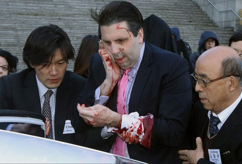 Ο Αμερικανός διπλωμάτης συμμετείχε σ’ ένα φόρουμ στο κέντρο της Σεούλ, όταν ένας άνδρας τον τραυμάτισε με ξυράφι. Επικράτησε πανικός. Κόσμος άρχισε να φωνάζει, την ίδια στιγμή που ο 42χρονος πρέσβης προσπαθούσε να προστατευτεί από τον δράστη, βάζοντας τα χέρια του μπροστά στο πρόσωπο.