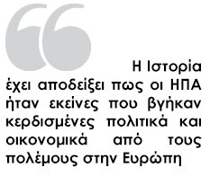 Η Ιστορία έχει αποδείξει πως οι ΗΠΑ ήταν εκείνες που βγήκαν κερδισμένες πολιτικά και οικονομικά από τους πολέμους στην Ευρώπη. Η εισροή ευρωπαϊκών κεφαλαίων μετά τον Α’ και Β’ Παγκόσμιο Πόλεμο κατέστησαν υπερδύναμη την Αμερική.