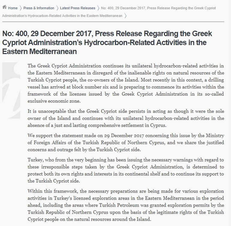 «Η ελληνοκυπριακή διοίκηση συνεχίζει μονομερώς τις σχετιζόμενες με τους υδρογονάνθρακες έρευνές της παραγνωρίζοντας τα αναπαλλοτρίωτα δικαιώματα που έχουν οι Τουρκοκύπριοι, ως συνιδιοκτήτες του νησιού, στους φυσικούς πόρους του νησιού. Πρόσφατα, σε αυτό το πλαίσιο, ένα σκάφος γεωτρήσεων κατέπλευσε στο οικόπεδο έξι το οποίο ξεκίνησε προετοιμασίες στο πλαίσιο των αδειών που εξέδωσε η ελληνοκυπριακή διοίκηση στη λεγόμενη ΑΟΖ.