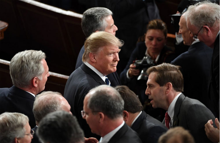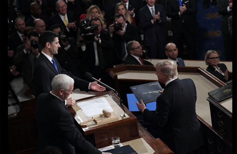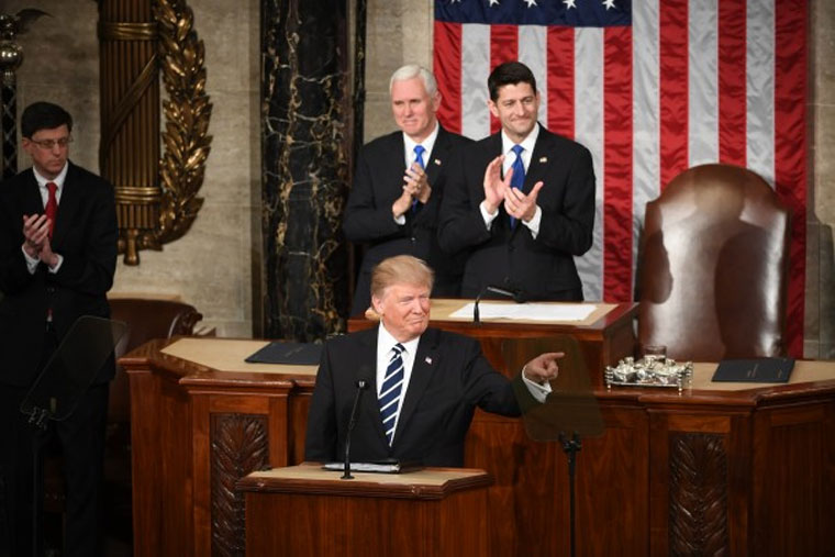 Αντιθέτως οι Ρεπουμπλικάνοι, που έχουν την πλειοψηφία και στα δύο σώματα του Κογκρέσου, τον επευφημούσαν συνεχώς, ακόμη πιο ζωηρά όταν αναφέρθηκε στα μεγάλα του σχέδια-την κατασκευή νέων πετρελαιαγωγών, την ανέγερση ενός «μεγάλου τείχους» στα σύνορα με το Μεξικό, τον αγώνα εναντίον της «ριζοσπαστικής ισλαμικής τρομοκρατίας».