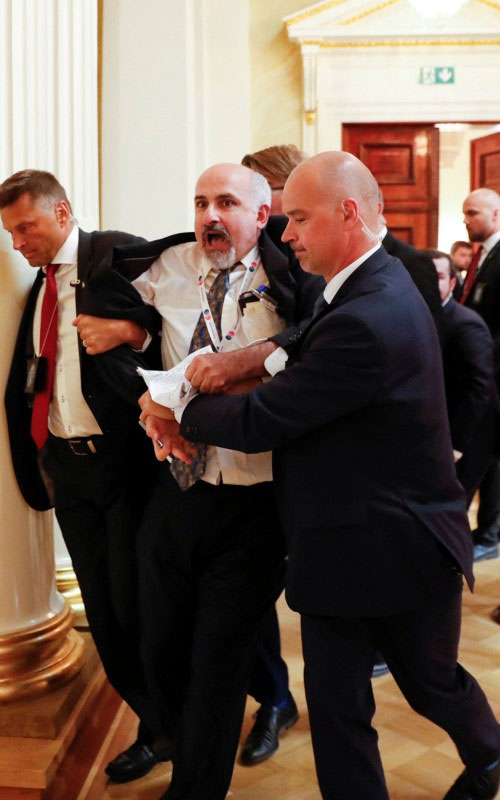 Λίγα λεπτά πριν μπουν στην αίθουσα ο Βλαντιμίρ Πούτιν και ο Ντόναλντ Τραμπ, ο διαδηλωτής ύψωσε ένα πλακάτ που έγραφε «Συνθήκη για την απαγόρευση των πυρηνικών». Άμεση ήταν η επέμβαση των ανδρών των υπηρεσιών ασφαλείας που τον απομάκρυναν αμέσως από την αίθουσα.
