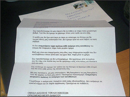 Στην επιστολή μεταξύ άλλων αναφέρεται: «Σας προειδοποιούμε και δεν μπλοφάρουμε. Θα αρχίσουμε από τα εγγόνια σας, θα πάμε στα παιδιά σας και θα αφήσουμε εσάς τελευταίους για να πονέσετε όσο και εμείς».