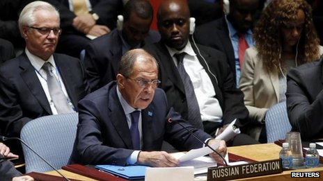 Από την πλευρά του ο υπουργός Εξωτερικών της Ρωσίας, Sergei Lavrov, χαιρέτησε την απόφαση, υπογραμμίζοντας πως «η Μόσχα είναι πανέτοιμη να λάβει μέρος σε όλες τις επιχειρήσεις στη Συρία», αφήνοντας ανοικτό το ενδεχόμενο συμμετοχής και σε ενδεχόμενη χρήση στρατιωτικής ισχύς με βάση το περιεχόμενο του Κεφαλαίου 7 της χάρτας του Ο.Η.Ε.. Ωστόσο, φρόντισε να στείλει και ένα ξεκάθαρο μήνυμα προς την Αντιπολίτευση της Συρίας, λέγοντας πως «το θέμα δεν βρίσκεται μόνο στους ώμους της Δαμασκού», καλώντας έτσι τις δυνάμεις που αντιτίθενται στον πρόεδρο Bashar al-Assad να συνεργαστούν για την πλήρη εφαρμογή της απόφασης.
