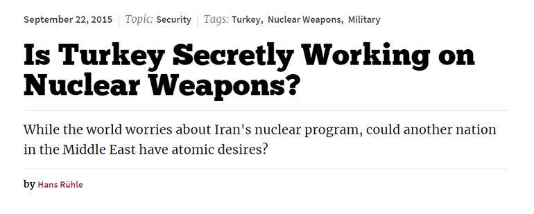 Το περιοδικό nationalinterest.org σε άρθρο του το 2015 θέτει κάποια στοιχεία και προβληματισμούς, ενώ αναφέρει πως κάποτε ο ισραηλινός πρωθυπουργός Μπέντζαμιν Νετανιάχουν είχε ενημερώσει το 2010 τον τότε πρωθυπουργό Γεώργιο Παπανδρέου ότι «η Τουρκία μπορεί να γίνει πυρηνική δύναμη όποτε το θελήσει». Αναφέρει, επίσης, ότι οι γερμανικές μυστικές υπηρεσίες ερευνούσαν αυτό το ενδεχόμενο.