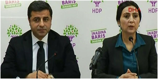 Οι συμπρόεδροι του κουρδικού κόμματος HDP Selahattin Demirtaş (αριστερά) και η Figen Yüksekdağ ανακοίνωσαν σε συνέντευξη Τύπου πως οι προεκλογικές συνθήκες για το κόμμα τους ήταν άνισες επειδή υποχρεώθηκαν να αναστείλουν όλες τις προεκλογικές συγκεντρώσεις μετά τις πολύνεκρες βομβιστικές επιθέσεις εναντίον οπαδών τους.