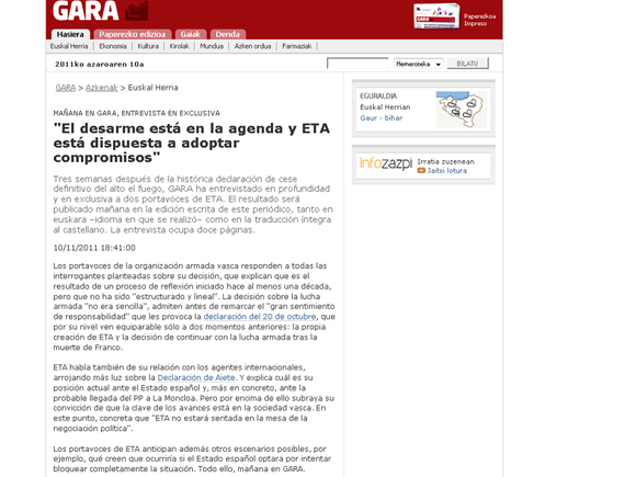 «Ο αφοπλισμός είναι στην ατζέντα και η ΕΤΑ είναι διατεθειμένη να αναλάβει δεσμεύσεις», είναι ο τίτλος της εφημερίδας «Gara» που παρουσιάζει την αποκλειστική συνέντευξη που της έδωσαν δύο μέλη της βασκικής αυτονομιστικής οργάνωσης.