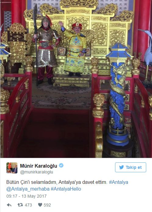 Πρόκειται για τον Νομάρχη της επαρχίας της Αττάλειας, Münir Karaloğlu, ο οποίος μαζί με τον προσωπικό του φρουρό ντύθηκαν με παραδοσιακές κινέζικες στολές σε επίσκεψη τους στη χώρα, και με αυτόν τον… ομολογουμένως κιτς τρόπο, αισιοδοξεί να δει την πόλη του να πλημμυρίζει από τουρίστες.