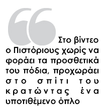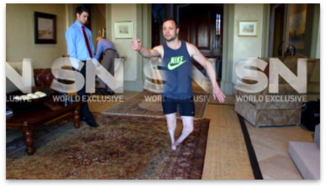 Στο βίντεο εμφανίζεται ο Όσκαρ Πιστόριους να καταφτάνει χωρίς τα προσθετικά του μέλη σε ένα σαλόνι και να προτάσσει το δεξί του χέρι σαν να κρατά όπλο.
