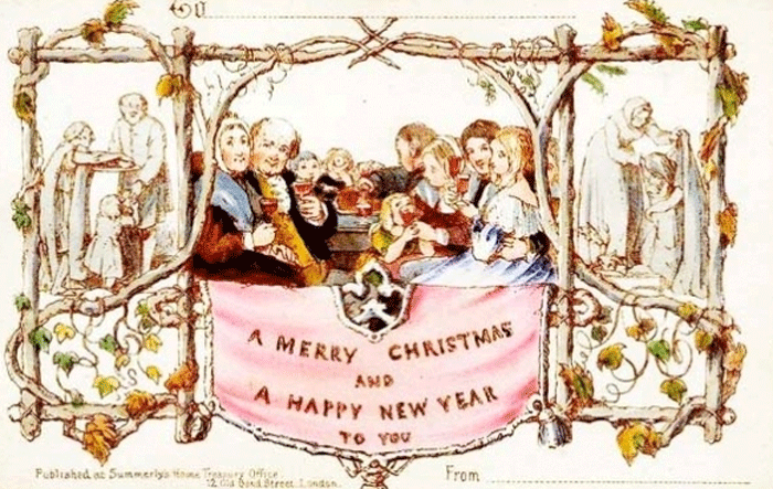 Ήταν το 1843, χρονιά έκδοσης και της περίφημης «Χριστουγεννιάτικης ιστορίας» του Ντίκενς, οπότε και η συγκεκριμένη κάρτα αποτυπώνει θεματικά τους δύο κόσμους, των πλούσιων και των φτωχών, που χαρακτήρισαν με την έντονη αντίθεσή τους τη βικτωριανή εποχή και το «αίτημα» της χριστουγεννιάτικης φιλανθρωπίας απ’ τους ευημερούντες, που ακόμη και σήμερα ζωντανεύει ως «εποχική αξία». Οι γιρλάντες από κισσό που ζωγράφισε δημιουργούσαν ένα ρομαντικό πλαίσιο και τα σχέδιά της αναπαριστούσαν φιλανθρωπικές πράξεις (ένδυσης και σίτισης φτωχών και πεινασμένων). Το κεντρικό θέμα έδειχνε μια χαρούμενη οικογενειακή συγκέντρωση, όπου τα μέλη της έκαναν μια πρόποση για τα Χριστούγεννα. Σε αυτή την πρώτη κάρτα ήταν εμφανή και τα δυο βασικά στοιχεία των Βικτωριανών Χριστουγέννων, δηλαδή οι αγαθές πράξεις και ο συνδυασμός καλού φαγητού και ποτού. Οι αγγλικές χριστουγεννιάτικες κάρτες που ακολούθησαν (τυπωμένες με τη μέθοδο της χρωμολιθογραφίας) είχαν ρομαντικό ύφος και, απαραιτήτως, περίτεχνες ανάγλυφες χρωματιστές μπορντούρες. Το κεντρικό μοτίβο απεικόνιζε συνήθως άνθη ή πουλιά επάνω στα κλαδιά, χαρούμενα παιδιά με παιχνίδια και λουλούδια στα χέρια, λιλιπούτειες νεράιδες και ξωτικά και γενικά εικόνες φύσης, παιχνιδιού και χαράς.
