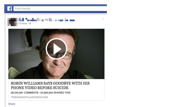 Το πρώτο μήνυμα που εμφανίζεται είναι ένα post που έχει κοινοποιηθεί από κάποια επαφή σας με τίτλο, «ROBIN WILLIAMS SAYS GOODBYE WITH HIS PHONE VIDEO BEFORE SUICIDE» (Ο ROBIN WILLIAMS ΛΕΕΙ ΤΟ ΤΕΛΕΥΤΑΙΟ ΑΝΤΙΟ ΣΤΟ ΤΗΛΕΦΩΝΟ ΠΡΙΝ ΑΥΤΟΚΤΟΝΗΣΕΙ).
