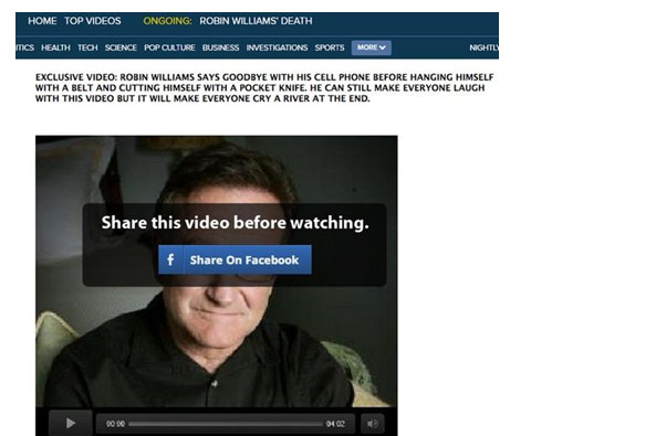 Κάνοντας κλικ στον σύνδεσμο του Facebook μεταφέρεστε σε διαδικτυακό τόπο τρίτου, ο οποίος ισχυρίζεται ότι έχει στην κατοχή του το υποτιθέμενο βίντεο που μαγνητοσκόπησε ο ίδιος ο Williams στο κινητό του λίγα λεπτά πριν από τον θάνατο του.