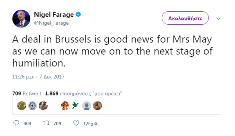 «Μια συμφωνία στις Βρυξέλλες είναι μια καλή είδηση για την κα Μέι καθώς τώρα μπορούμε να προχωρήσουμε στο επόμενο στάδιο της ταπείνωσης», σημειώνει σε μήνυμά του στο Twitter ο πρώην αρχηγός του ευρωφοβικού UKIP.