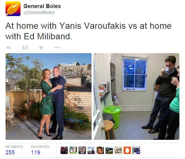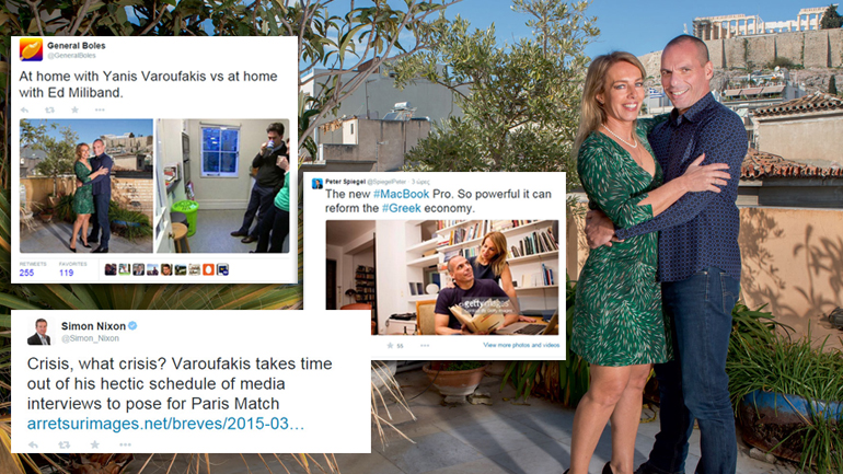 «Κύμα» ειρωνικών σχολίων και αναρτήσεων στο Twitter προκάλεσε η φωτογράφιση του Γιάνη Βαρουφάκη και της συζύγου του στο «Paris Match»Τα αρνητικά σχόλια μιλούν -μεταξύ άλλων- για προκλητικά «λιτό βίο» σε αριστερό ύφος και ήθος, και κάνουν λόγο για τον απόλυτο ορισμό του Life Style σε αστικά πρότυπα, την ώρα που δεκάδες νοικοκυριά στην Ελλάδα βιώνουν την εξαθλίωση και τη στιγμή που η χώρα βρίσκεται σε διαπραγματεύσεις με τους εταίρους για να αποφύγει τη χρεοκοπία.