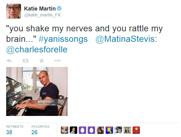 Η Κέιτι Μάρτιν από τη «Wall Street Journal» ανήρτησε στο Twitter: «Έχει φωτογραφηθεί για το Hello ή ακόμα; Μήπως για το Tatler; Μαντεύω ότι είναι ενθουσιώδης περισσότερο με τα κοσμικά (socialites) από ό,τι με τους σοσιαλιστές (socialists)», ενώ σε νέο tweet αφιέρωσε στον Έλληνα υπουργό Οικονομικών τον στίχο «μου ταράζεις τα νεύρα».