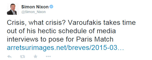 Συγκεκριμένα, ο Σάιμον Νίξον από τη «Wall Street Journal» γράφει: «Κρίση, ποια κρίση; Ο Βαρουφάκης κάνει διάλειμμα από το ταραχώδες πρόγραμμά του με τις συνεντεύξεις στα media, για να ποζάρει για το Paris Match»