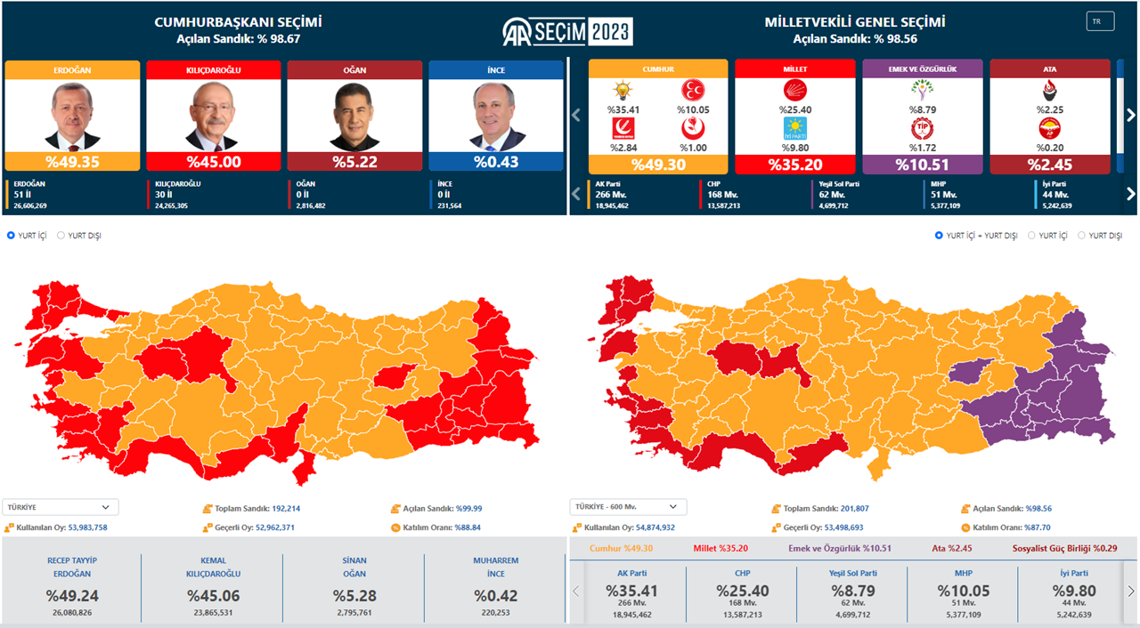 Όμως, σύμφωνα με τα αποτελέσματα που δίνει στην δημοσιότητα το Anadolu, με καταμετρημένο το 98,67% των ψήφων ο Τούρκος πρόεδρος προηγείται με ποσοστό 49,35%, ενώ ο Κεμάλ Κιλιτσντάρογλου λαμβάνει ποσοστό 45,00%.