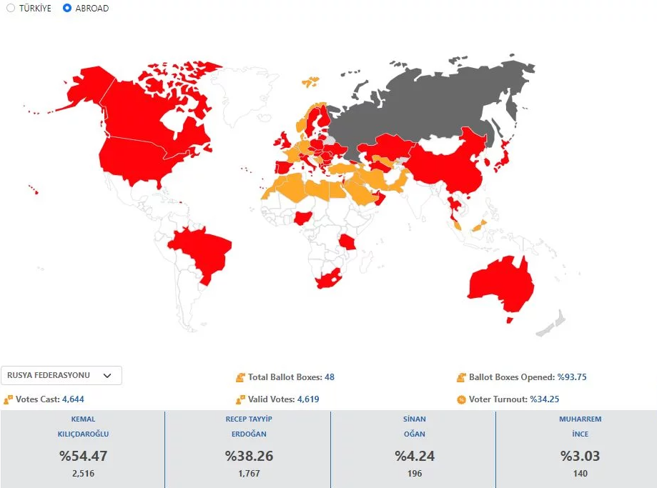 Οι Τούρκοι ψηφοφόροι της Ρωσίας, επέλεξαν επίσης για επόμενο πρόεδρο τον Κεμάλ Κιλιτσντάρογλου με 54,47%, συγκριτικά με τον Ρετζέπ Ταγίπ Ερντογάν 38,26%, με το 93.75% των ψήφων να έχουν καταμετρηθεί μέχρι στιγμής.