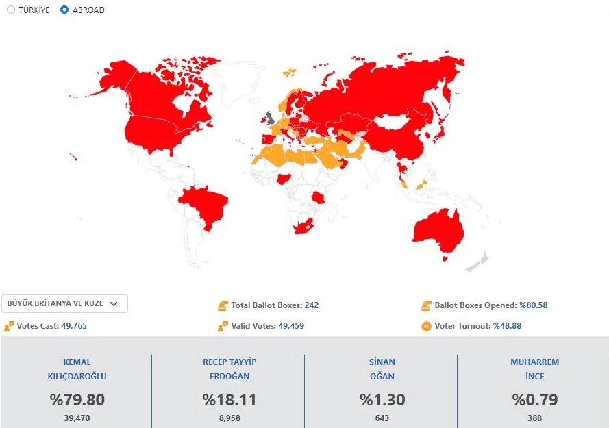 Όσον αφορά στη Βρετανία ο Κεμάλ Κιλιτσντάρογλου προηγείται συντριπτικά με 79,8%, σε σχέση με τον Ερντογάν που έχει συγκεντρώσει 18,11%, σύμφωνα με τις τουρκικές ψήφους που έχουν καταμετρηθεί σε ποσοστό 80,58%.