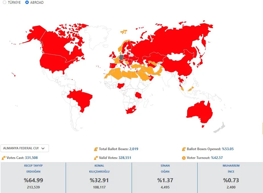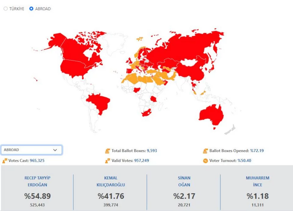Οι Τούρκοι της διασποράς φαίνεται να επέλεξαν τον Ρετζέπ Ταγίπ Ερντογάν ως τον επόμενο Τούρκο πρόεδρο, με ποσοστό 54,89%, σε σχέση με τον Κεμάλ Κιλιτσντάρογλου που έχει ποσοστό 41,76%, με το 72,19% των ψήφων να έχουν καταμετρηθεί.