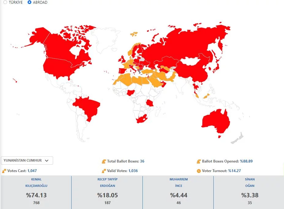 Οι Τούρκοι ψηφοφόροι στην Ελλάδα επέλεξαν με συντριπτική πλειοψηφία (74,13%) τον Κεμάλ Κιλιτσντάρογλου, σε σχέση με το 18,05% που ψήφισαν τον Ερντογάν, με το 88,89% των ψήφων να έχουν καταμετρηθεί μέχρι στιγμής.
