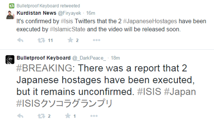 Φήμες κατακλύζουν το Twitter ότι, λίγες ώρες αφότου έληξε το τελεσίγραφο που είχαν δώσει οι τζιχαντιστές στο Τόκιο για την καταβολή λύτρων ώστε να αφεθούν ελεύθεροι οι δύο Ιάπωνες όμηροι, τελικά οι Κέντζι Γκότο και ο Χαρούνα Γιακάουα εκτελέστηκαν.