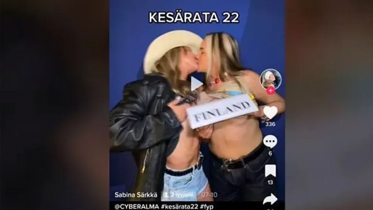 Η φωτογραφία, που δημοσιεύθηκε από φινλανδικά ΜΜΕ, δείχνει δύο γυναίκες να φιλιούνται, σηκώνοντας τις μπλούζες τους για να αποκαλύψουν τα στήθη τους και να τα καλύψουν με την επιγραφή «Φινλανδία».