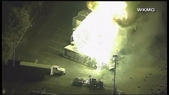 Εικόνες από τα αμερικανικά τηλεοπτικά δίκτυα δείχνουν ένα πυκνό σύννεφο μαύρου καπνού να βγαίνει μέσα από το εργοστάσιο προπανίου, κάνοντας την ατμόσφαιρα αποπνικτική.