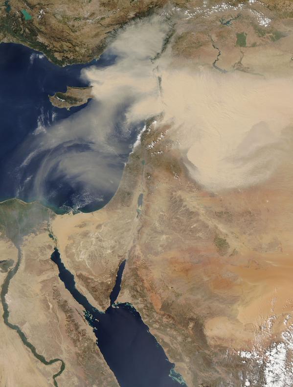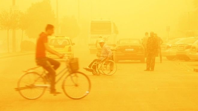 Κάτοικοι της περιοχής ανέβασαν ηλεκτρονικά φωτογραφίες που δείχνουν τεράστια σύννεφα με σκόνη. Θύελλες που συνοδεύονται από σκόνη πλήττουν συχνά τη Μέση Ανατολή στη διάρκεια του καλοκαιριού, αλλά επικεντρώνονται στο Ιράκ και στην περιοχή του Κόλπου όπου σύννεφα άμμου μαζεύονται πάνω από άνυδρες περιοχές.