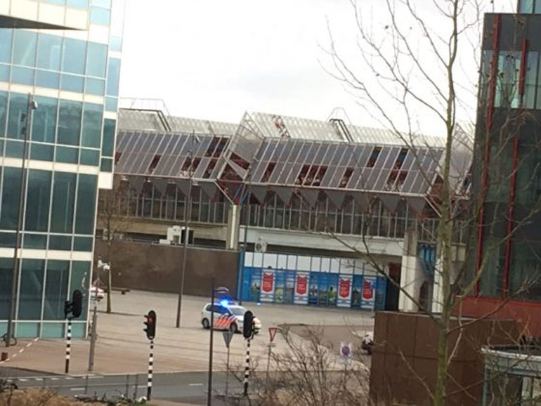 Στο Ρότερνταμ, κοντέινερ ανατράπηκαν και ολόκληρες στέγες ξεριζώθηκαν από σπίτια, σύμφωνα με τηλεοπτικά πλάνα.