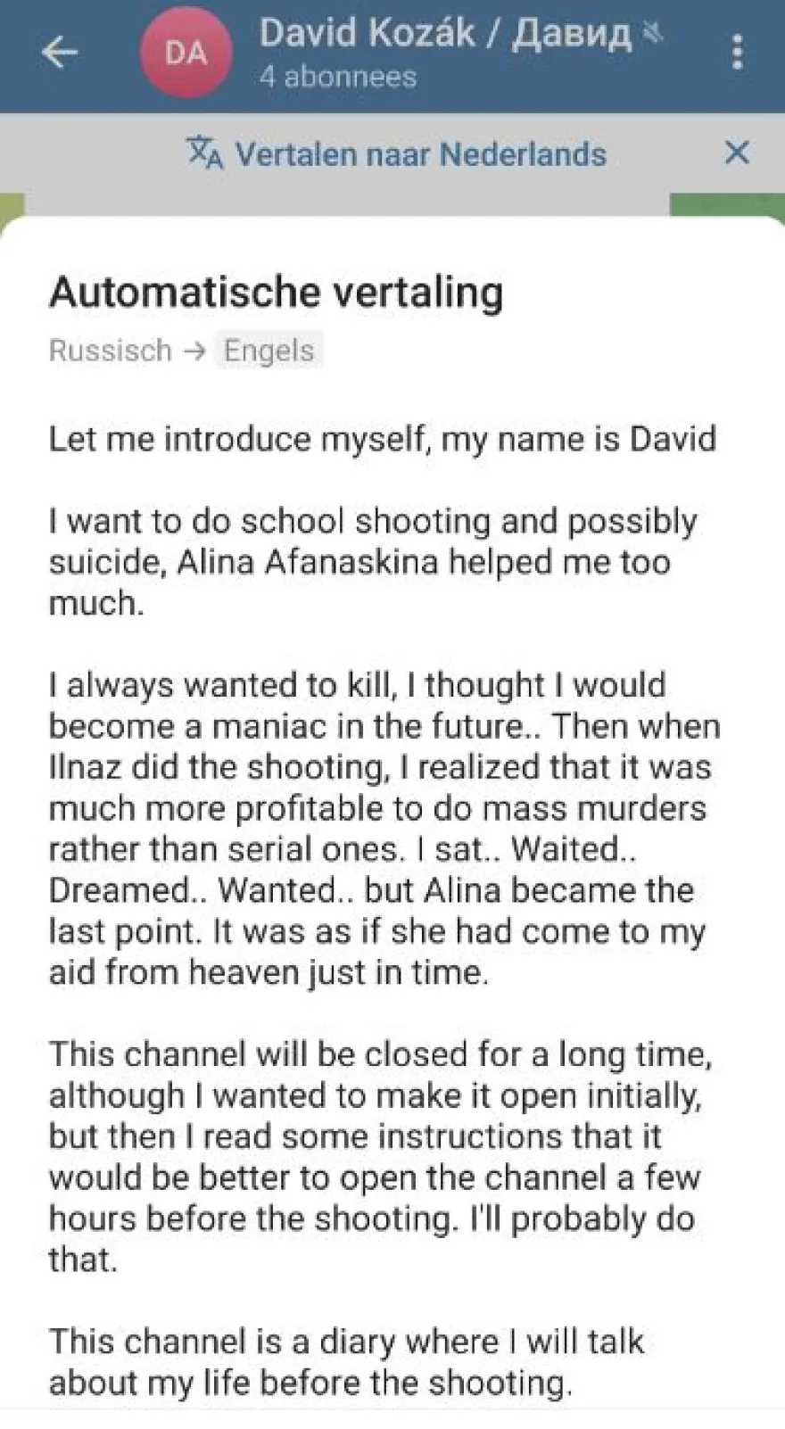 Καθώς σχεδίαζε την δολοφονική επίθεση, ο Κόζακ πιστεύεται ότι κρατούσε ένα ημερολόγιο στα ρωσικά στην εφαρμογή Telegram, γράφοντας σε μια ανατριχιαστική ανάρτηση: «Θέλω να κάνω ένα μακελειό στο πανεπιστήμιο και πιθανώς να αυτοκτονήσω».