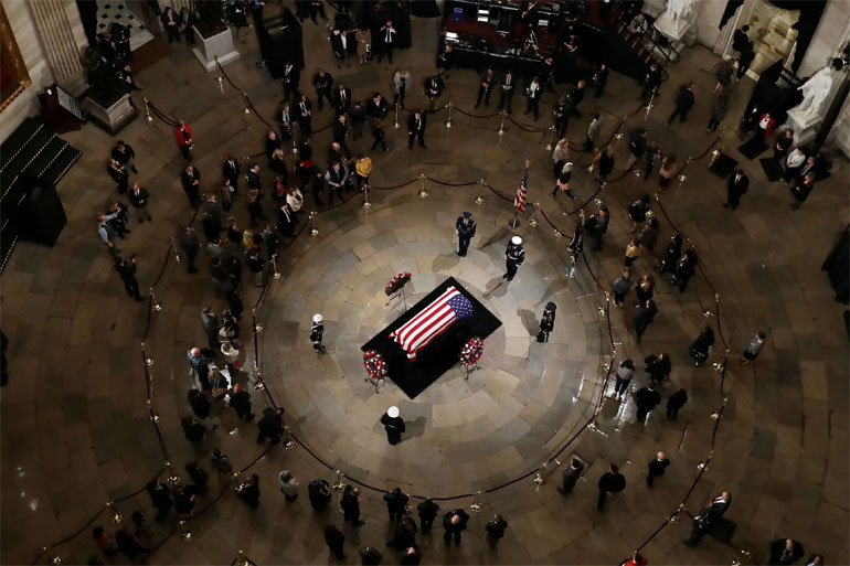 Κατά τη δύση του ηλίου, η σορός του Τζορτζ Χέρμπερτ Ουόκερ Μπους, την οποία ανέμεναν ο γιος του – και 43ος πρόεδρος των ΗΠΑ – Τζορτζ Ουόκερ Μπους και οικείοι του με το χέρι στην καρδιά, πέρασε τις πύλες της επιβλητικής έδρας του Κογκρέσου, όπου ο εκλιπών είχε αρχίσει τη μακρά πολιτική του σταδιοδρομία τη δεκαετία του 1960.