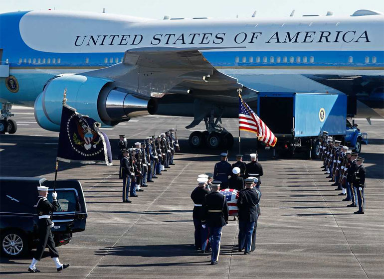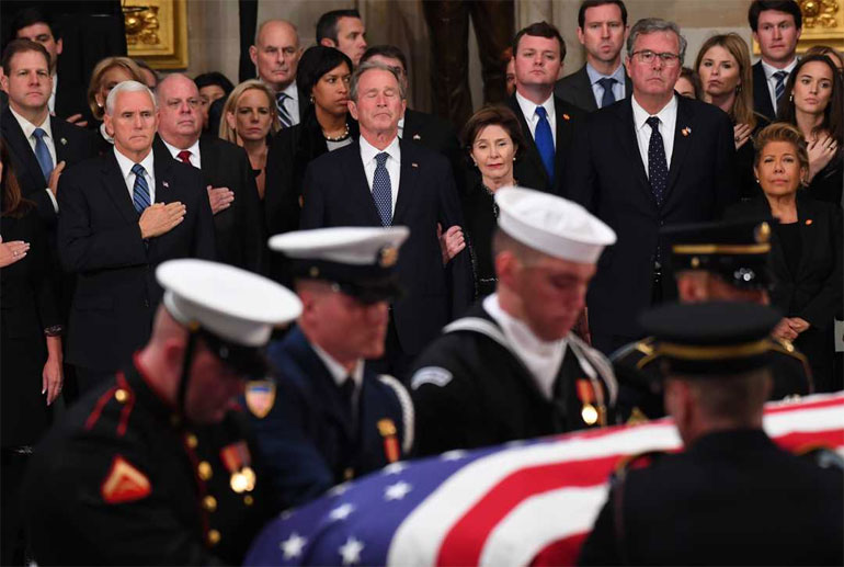 Κατά τη δύση του ηλίου, η σορός του Τζορτζ Χέρμπερτ Ουόκερ Μπους, την οποία ανέμεναν ο γιος του – και 43ος πρόεδρος των ΗΠΑ – Τζορτζ Ουόκερ Μπους και οικείοι του με το χέρι στην καρδιά, πέρασε τις πύλες της επιβλητικής έδρας του Κογκρέσου, όπου ο εκλιπών είχε αρχίσει τη μακρά πολιτική του σταδιοδρομία τη δεκαετία του 1960.