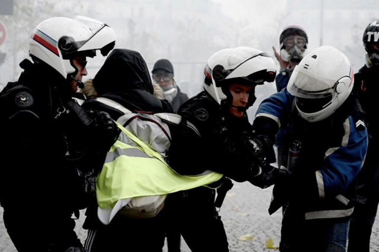 «Καλώ τους διαδηλωτές να αποχωρήσουν από την Πλας ντ’ Ιταλί», δήλωσε σε συνέντευξη Τύπου ο αρχηγός της αστυνομίας του Παρισιού Ντιντιέ Λαλμόν. Αξιωματούχοι δήλωσαν ότι οι διαδηλωτές πέταξαν στο σημείο αυτό πέτρες στους πυροσβέστες, και σύμφωνα με τον Λαλμόν οι δυνάμεις ασφαλείας έγιναν στόχος επιθέσεων. Τα τηλεοπτικά δίκτυα μετέδωσαν εικόνα από σπασμένες βιτρίνες καταστημάτων, πυρπολημένων οχημάτων και διαδηλωτές με καλυμμένα τα πρόσωπά τους να συγκρούονται με τις αστυνομικές δυνάμεις. Οι περισσότεροι από αυτούς τους διαδηλωτές δεν φορούσαν τα χαρακτηριστικά «κίτρινα γιλέκα».