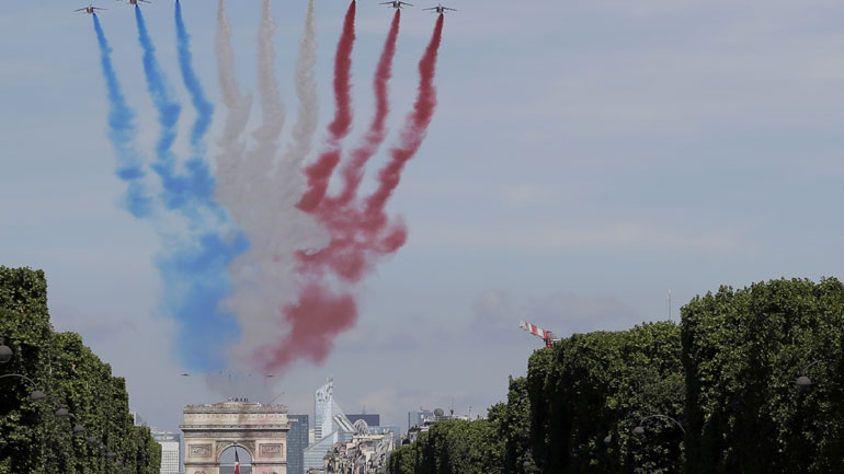 Φέτος, το ιππικό και οι ένοπλες δυνάμεις της Γαλλίας παρέλασαν χωρίς φόβο στην «καρδιά» του Παρισιού και στο πλευρό του Γάλλου προέδρου στεκόταν ο Ντόναλντ Τραμπ, o άνθρωπος που έχει δείξει ιδιαίτερα σκληρή στάση απέναντι στην τρομοκρατία.