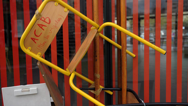 Σύμφωνα με φοιτητές που βρίσκονταν στη Σχολή πριν αποκλειστεί η είσοδος και τράβηξαν φωτογραφίες, έχουν γραφτεί συνθήματα στους διαδρόμους και στο μνημείο των πεσόντων και πόρτες έχουν βγει από τη θέση τους. «Τα γκράφιτι στο μνημείο των πεσόντων δεν είχαν συμφωνηθεί», δήλωσε ένας από αυτούς που δεν θέλησε να πει το όνομά του. «Στους νεκρούς μας που σκοτώθηκαν από την αστυνομία σας» λέει ένα από τα συνθήματα που έχουν αναγραφεί πάνω στον κατάλογο των φοιτητών της ENS που σκοτώθηκαν στον πόλεμο.