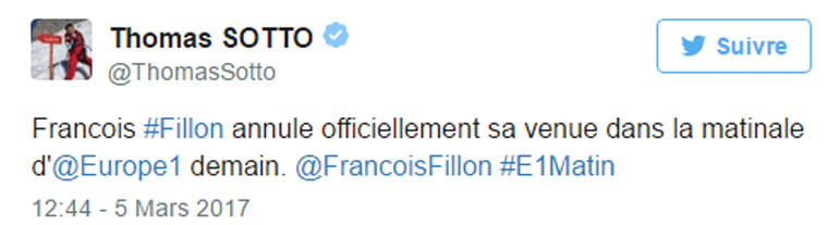 «Ο Φρανσουά Φιγιόν ματαίωσε επισήμως την εμφάνισή του στο πρωινό πρόγραμμα του Europe 1» έγραψε στον λογαριασμό του στο Twitter ο παρουσιαστής Τομάς Σότο.