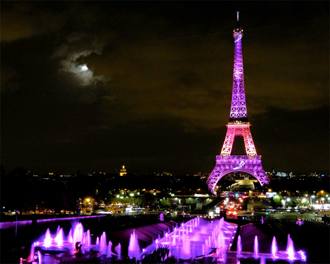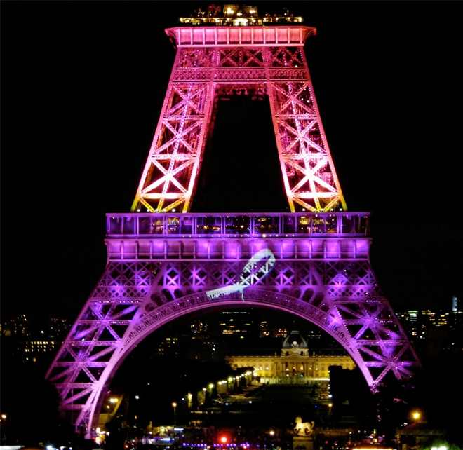 Όπως μετέδωσε το Γαλλικό Πρακτορείο Ειδήσεων (AFP), ο Οκτώβριος είναι αφιερωμένος στην πρόληψη της συγκεκριμένης ασθένειας, που απειλεί κάθε χρόνο τη ζωή εκατ. γυναικών. Είναι η πρώτη φορά που η -ηλικίας 125 ετών- μεταλλική κατασκευή γίνεται… ροζ. Η φωταγώγηση πραγματοποιήθηκε λίγο μετά τις 20.30 το βράδυ της Τετάρτης, τοπική ώρα, με τη δήμαρχο της πόλης Anne Hidalgo και τον πρόεδρο της «Estée Lauder» Henk Van Der Mark να βρίσκονται ανάμεσα σε αυτούς που πάτησαν το κουμπί για να ανάψουν τα φώτα.