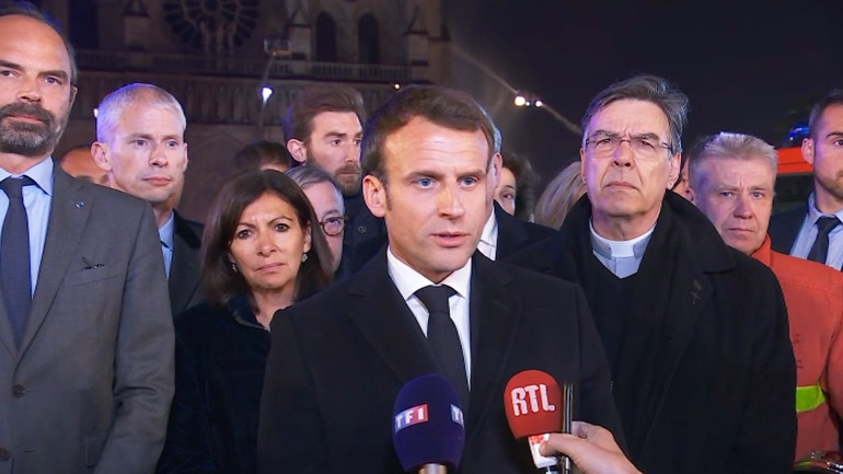 «Θα ανοικοδομήσουμε τη Νοτρ Νταμ μαζί», τόνισε ο Μακρόν, που εμφανώς δυσκολευόταν να συγκρατήσει τα συναισθήματά του, υποσχόμενος ότι αυτό θα είναι «το έργο μας τα χρόνια που θα έλθουν».