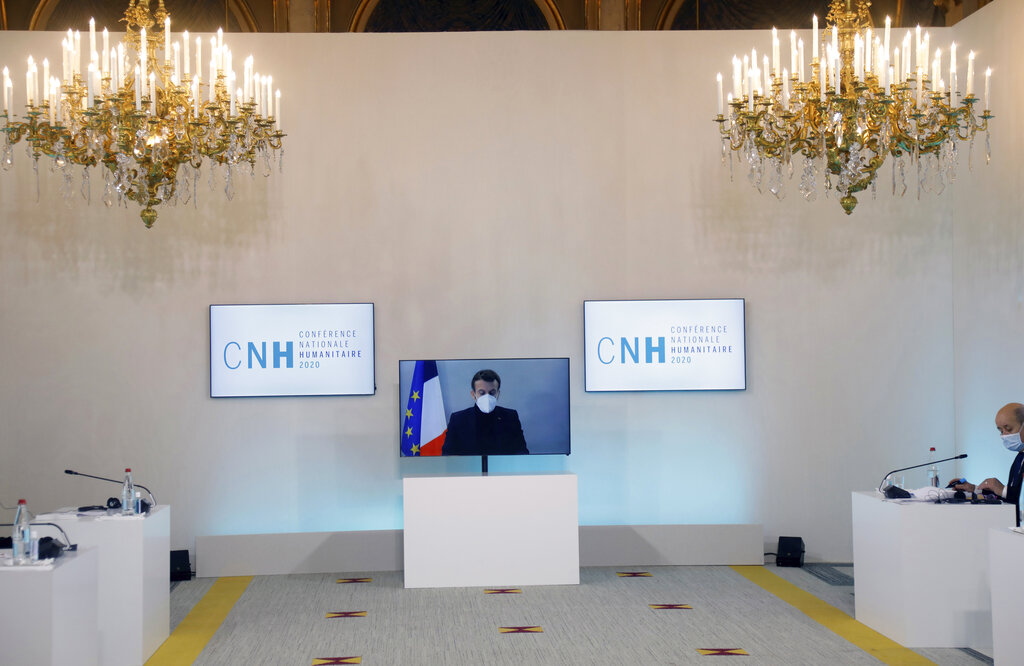 Ο Μακρόν έχει τεθεί σε καραντίνα στο Μέγαρο των Ηλυσίων αλλά συνεχίζει να εργάζεται εξ αποστάσεως. Λίγο νωρίτερα μίλησε μέσω βιντεοδιάσκεψης σε ένα συνέδριο σχετικά με τη γαλλική πολιτική παροχής ανθρωπιστικής βοήθειας. Ήταν καθισμένος πίσω από ένα γραφείο και φορούσε ζιβάγκο, σακάκι καθώς και μάσκα προσώπου.