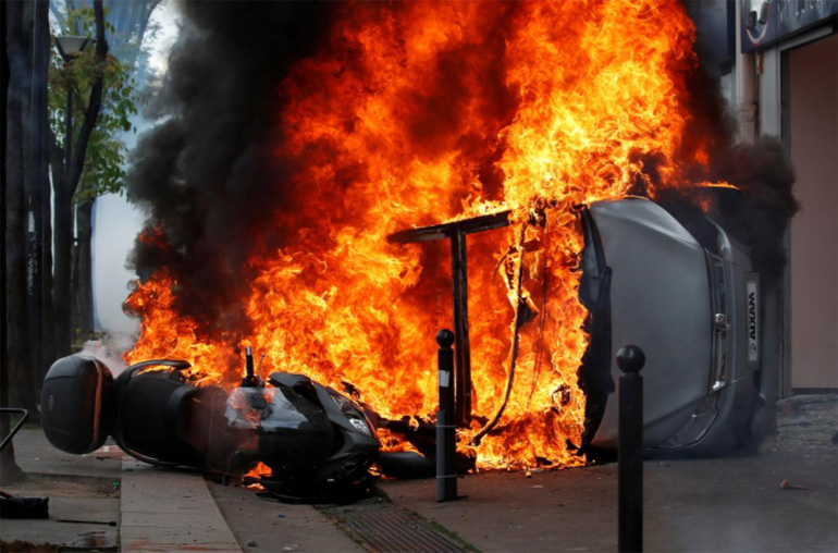 Στην κορυφή της πορείας, οι οργανώσεις των «black blocks» φώναζαν συνθήματα όπως «όλος ο κόσμος σιχαίνεται την αστυνομία» και «Παρίσι, ξεσηκώσου».