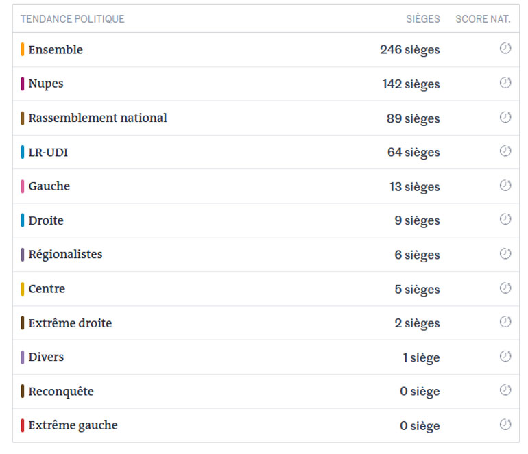 Η αριστερή πολιτική παράταξη «Nupes» του Ζαν Λικ Μελανσόν λαμβάνει 149 έδρες, η παράταξη της ακροδεξιάς Μαριν Λεπέν 89 ενώ οι Ρεπουμπλικάνοι 78 έδρες σύμφωνα με τον ίδιο τηλεοπτικό σταθμό.