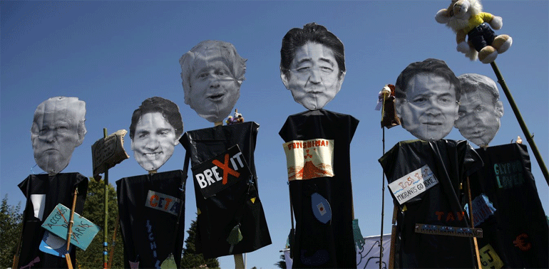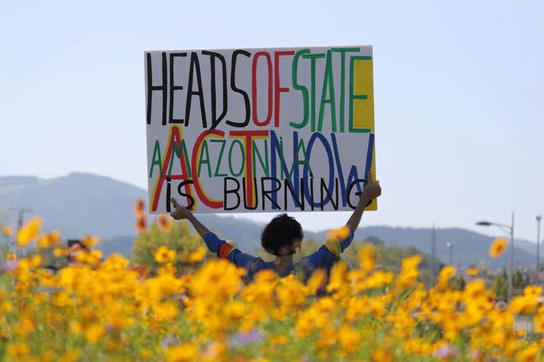 «Όχι στη G7. Για έναν καλύτερο κόσμο», έγραφε ένα πανό. «Επικεφαλής κρατών, ο Αμαζόνιος φλέγεται», έγραφε ένα άλλο.
