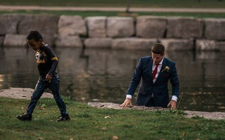Αναπάντεχη τροπή πήρε η γαμήλια φωτογράφιση του Clayton και της Brittany Cook στο Οντάριο. Ενώ το ζευγάρι είχε στηθεί μπροστά από το φωτογραφικό φακό ο γαμπρός παρατήρησε ένα μικρό αγόρι να πέφτει στο ποτάμι. Χωρίς δεύτερη σκέψη ο Clayton βούτηξε στο ποτάμι με το γαμπριάτικο κουστούμι και έσωσε το αγόρι!