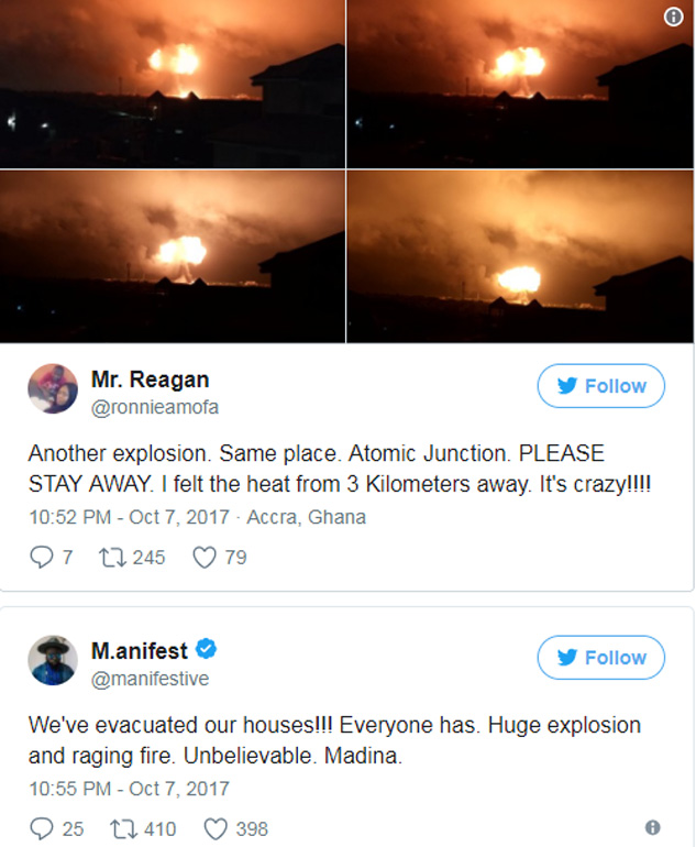Πυρκαγιές ξέσπασαν το βράδυ του Σαββάτου στην Άκρα έπειτα από δύο ισχυρές εκρήξεις σε σταθμό υγροποιημένου φυσικού αερίου και σε κοντινό πρατήριο καυσίμων, στο βορειοανατολικό τμήμα της πρωτεύουσας της Γκάνας.