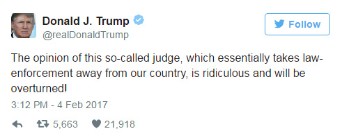 Ο Ντόναλντ Τραμπ έγραψε στον λογαριασμό του στο Twitter: “Η άποψη αυτού του αποκαλούμενου δικαστή, η οποία ουσιαστικά αφαιρεί την επιβολή του νόμου από τη χώρα μας, είναι γελοία και θα ανατραπεί”.
